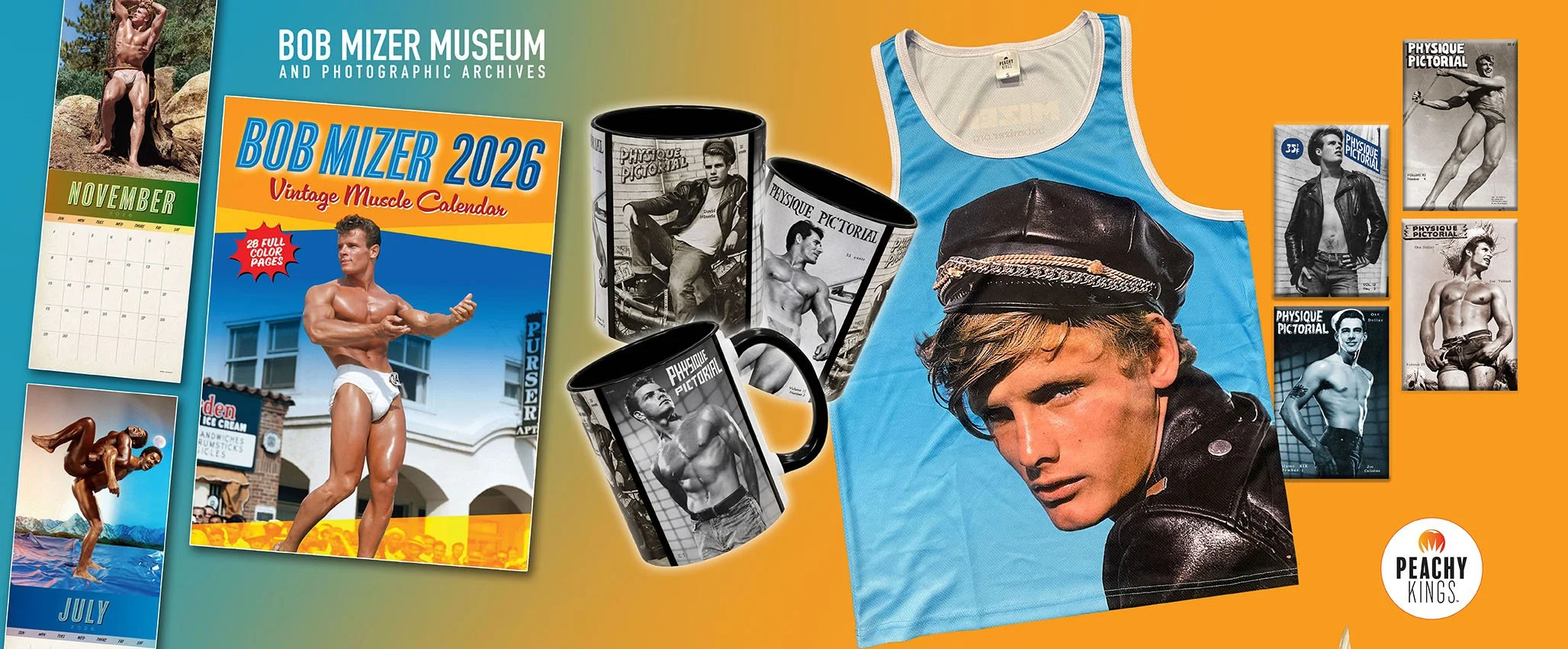 New to our collection this year is our line of BOB MIZER Merchandise. We have the 2026 Calendar, tanks & tees, mugs, postcards, magnets and more! Each one is a vibrant time capsule of Mizer’s trademark techinicolor, cheeky-yet-artful beefcake portraits. You’ll find bodybuilders, speedo-clad swimmers, sailors, tied-up tan hardbodies, gladiators, cowboys, and more! Many of these same models and portraits were included in his vintage Physique Pictorial magazines.