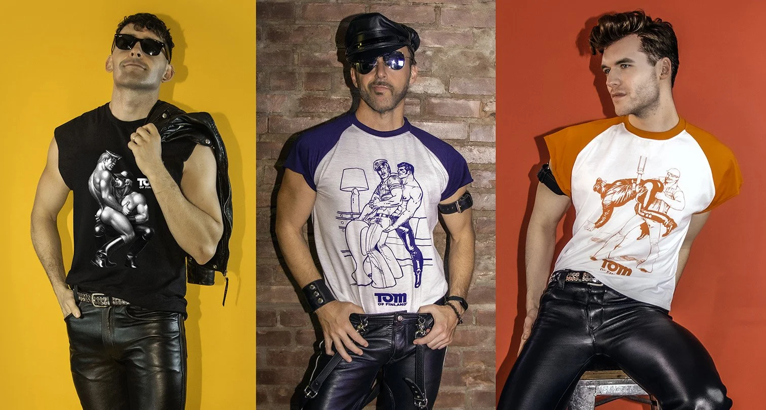 Our three most popular Tom of Finland tees — custom designed by Peachy Kings. First up is our black, sleeveless SUCK IT Tee — a bold and sexy choice! Next up is our navy REPAIR MAN Ringer tee. And finally, our bright orange HOOK UP Tee — featuring Tom’s stunning pen and ink KAKE “comic” illustrations.